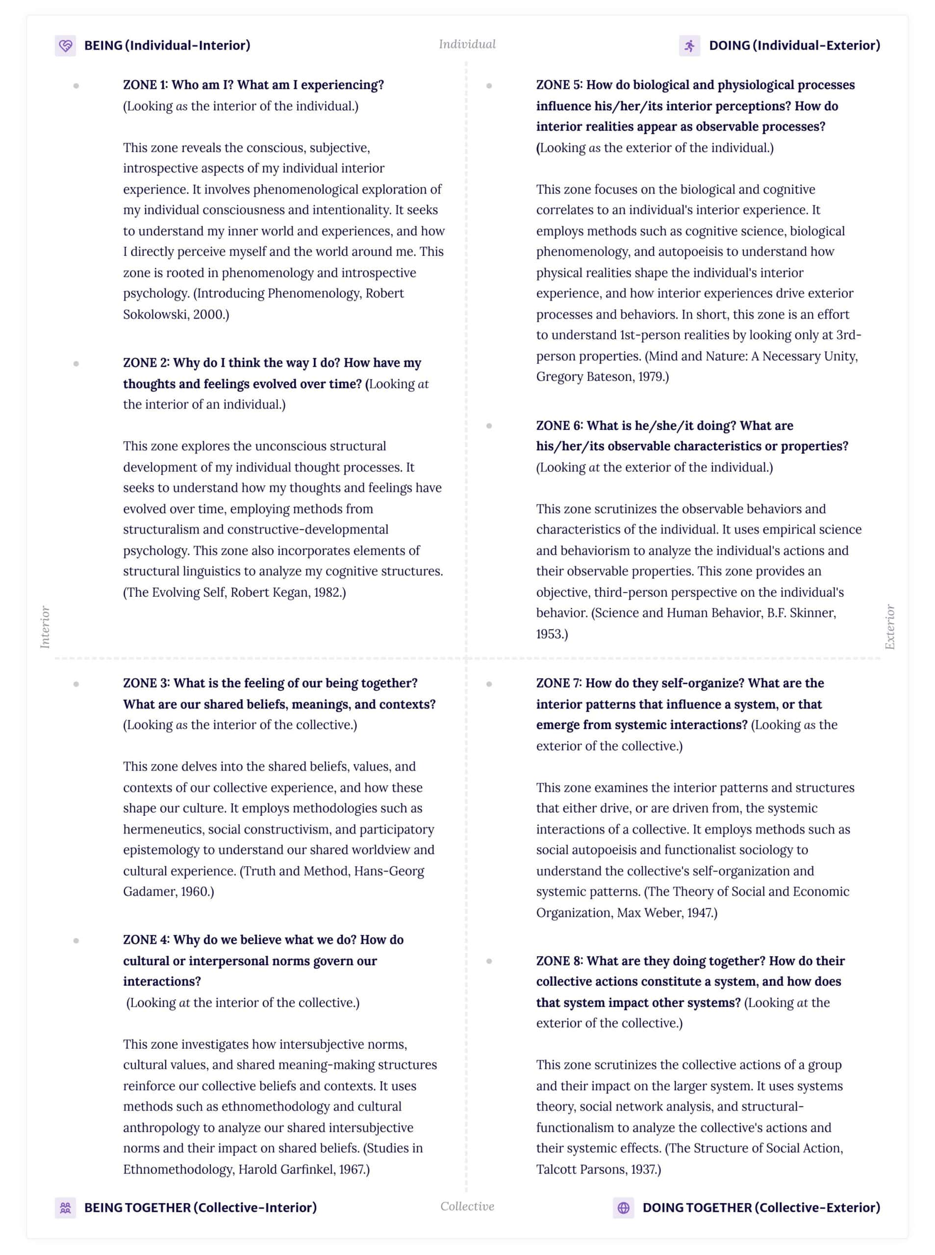 The 8 Zone framework is built upon the foundation of the four quadrants, which represent the four fundamental dimensions of human experience: individual-interior (“Being”), individual-exterior (“Doing”), collective interior (“Being Together”), and collective-exterior (“Doing Together”). Each of these quadrants offers a unique perspective on the nature of reality and human interaction: