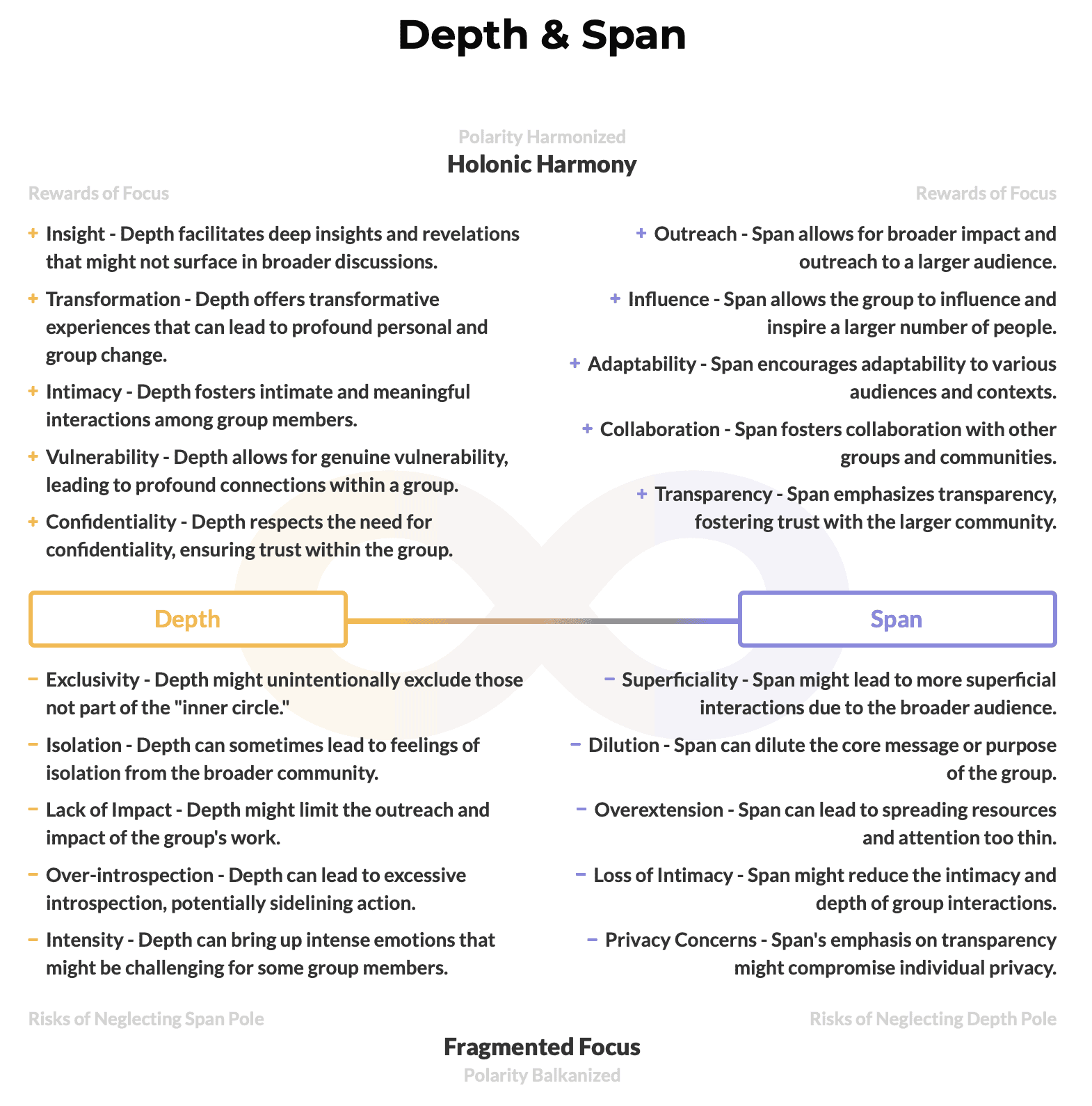 Balancing depth and span to foster both profound internal connections and broader societal impact. This approach recognizes the importance of deep, intimate group dynamics while also valuing the need for outreach, transparency, and broader influence. It ensures that the group remains grounded in its core values and purpose while also being adaptable and influential in the larger community.