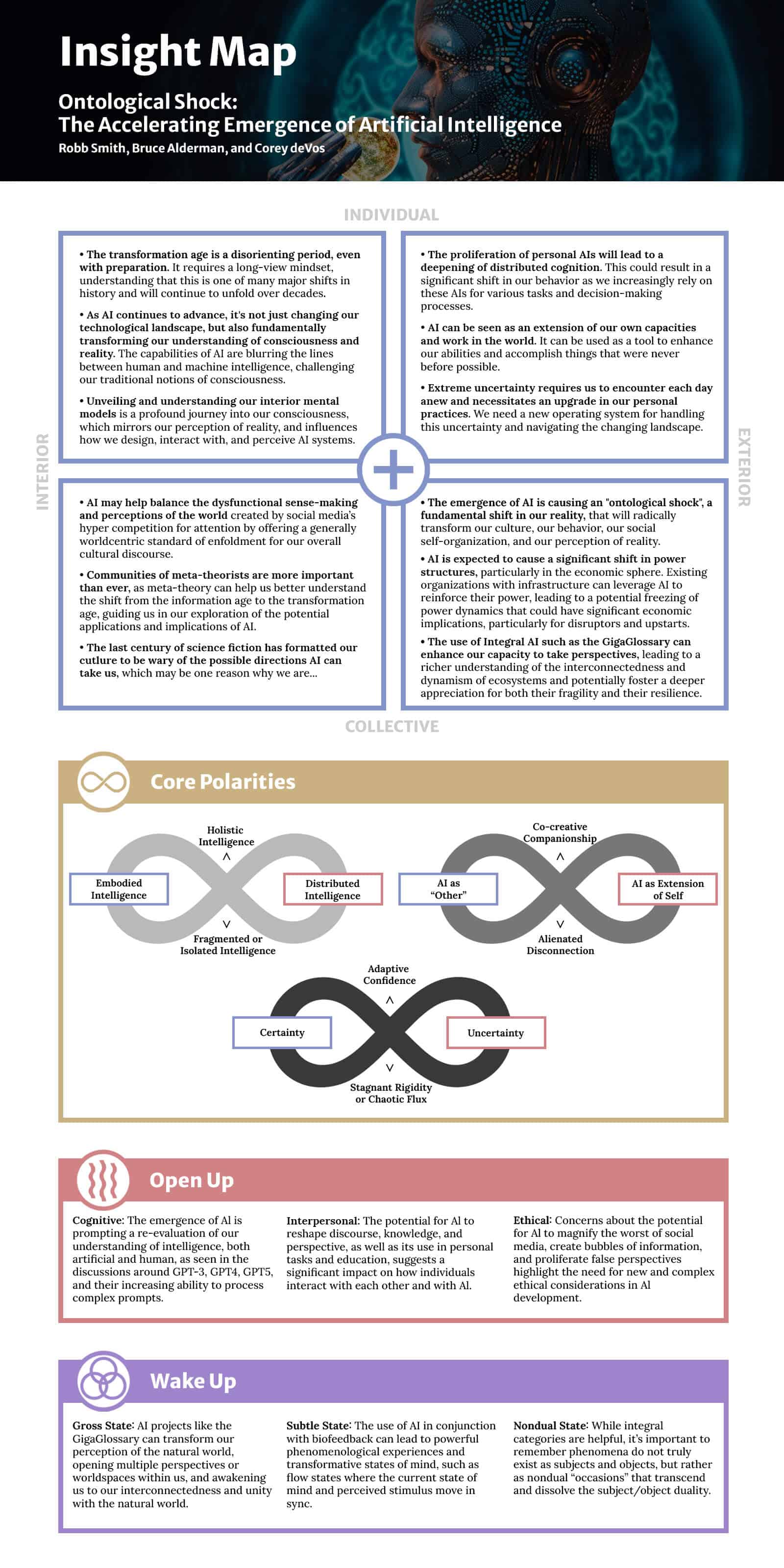 Despite the profound ontological shock that AI brings, it has also served as an extension of our capacities, enabling transformative work in organizations like Integral Life. Corey shares his work on various AI projects, such Holo, a responsive AI chatbot that is trained on integral ideas (members can find Holo in the lower right corner of this screen), as well as the Full Spectrum Polarities and GigaGlossary projects that leverage AI to support our growth and development, and to transform our perception of the world around us.